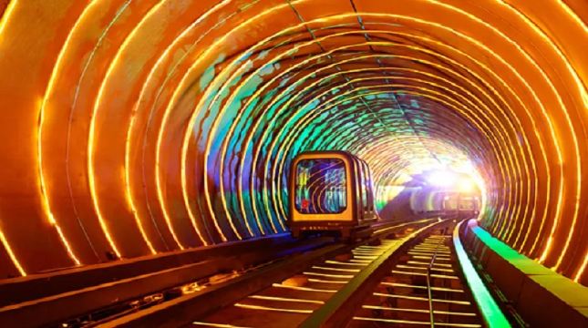 ▲ 外滩观光隧道连接外滩和浦东陆家嘴商圈,是我国第一条越江行人隧道。游客可以乘坐全透明观光车在色彩变换不断的隧道中穿越黄浦江,犹如时空穿梭一般。