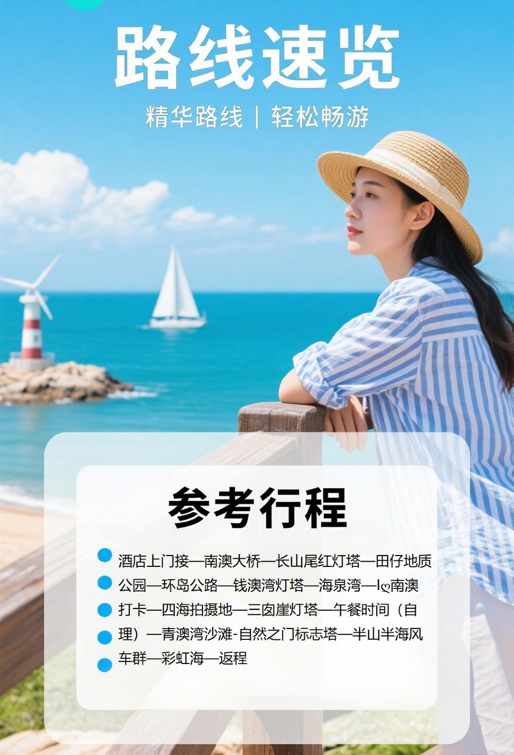 酒店上门接—南澳岛大桥—长山尾.红灯塔—田仔地质公园—环岛公路—钱澳湾灯塔—海泉湾—Iღ南澳打卡—四海拍摄地—三囱崖灯塔—青澳湾沙滩(可下水/玩沙子)—自然之门标志塔—半山半海风车群—彩虹海—返程送回