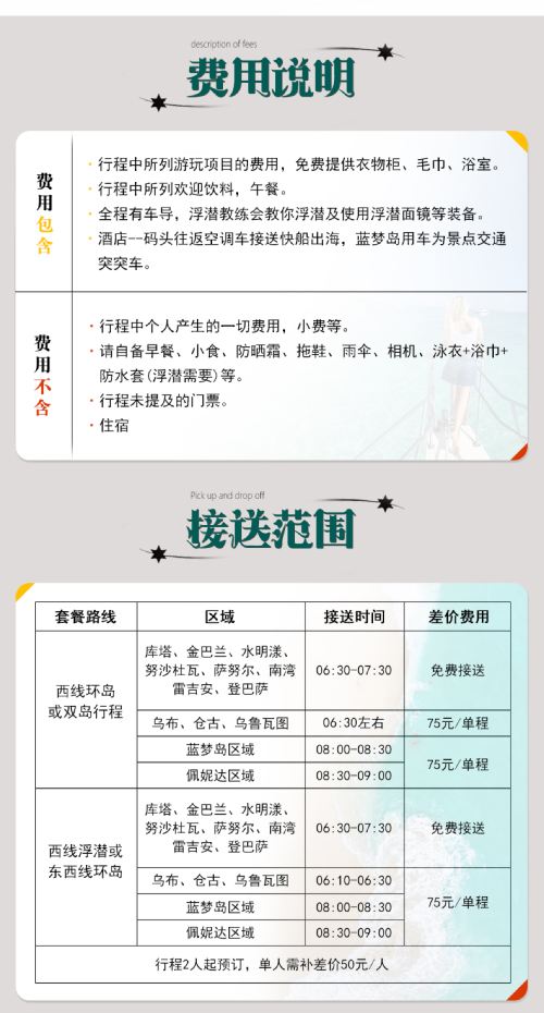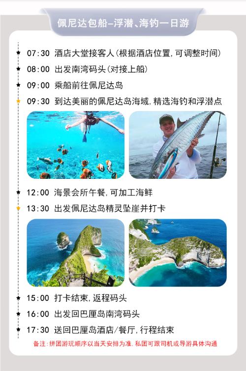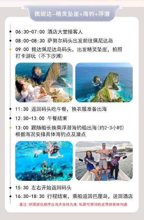 是巴厘岛酒店接去沙努尔码头坐公共船去佩妮达,上午打卡精灵坠崖,下午再乘坐螃蟹船出海海钓和浮潜(至多6人团),再坐公共船返回巴厘岛;