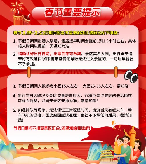 【外籍提醒】根据景区政策,外籍护照儿童1.2以上需按照成人选项下单,若您按照优惠人群下单当天产生的门票差价需要现补导游,望知晓。