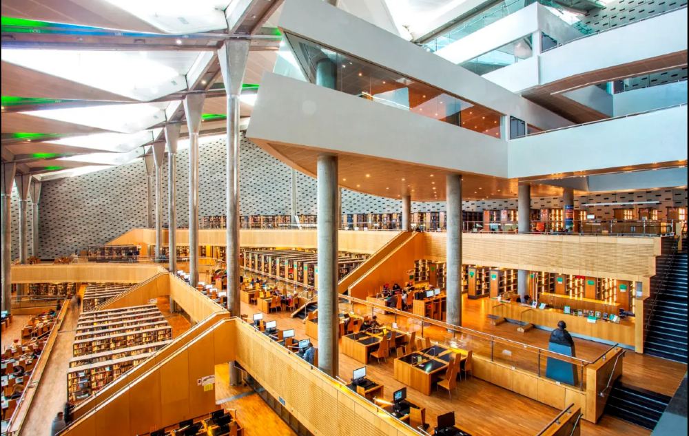 ▲ 这座充满了未来气息的碟片式建筑是全球知名的阅读场所,为读者们准备了2000多张座椅。整座建筑外面都写满了全球各种文字以反映图书馆的多文化传统与精神。这里收藏了800万册图书。