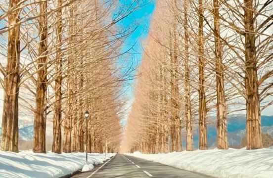 PlanB(玩雪+观光套餐的客人在箱馆山滑雪场停留约2.5小时后,随车出发前往琵琶湖水杉大道&Makino高原温泉sarasa)