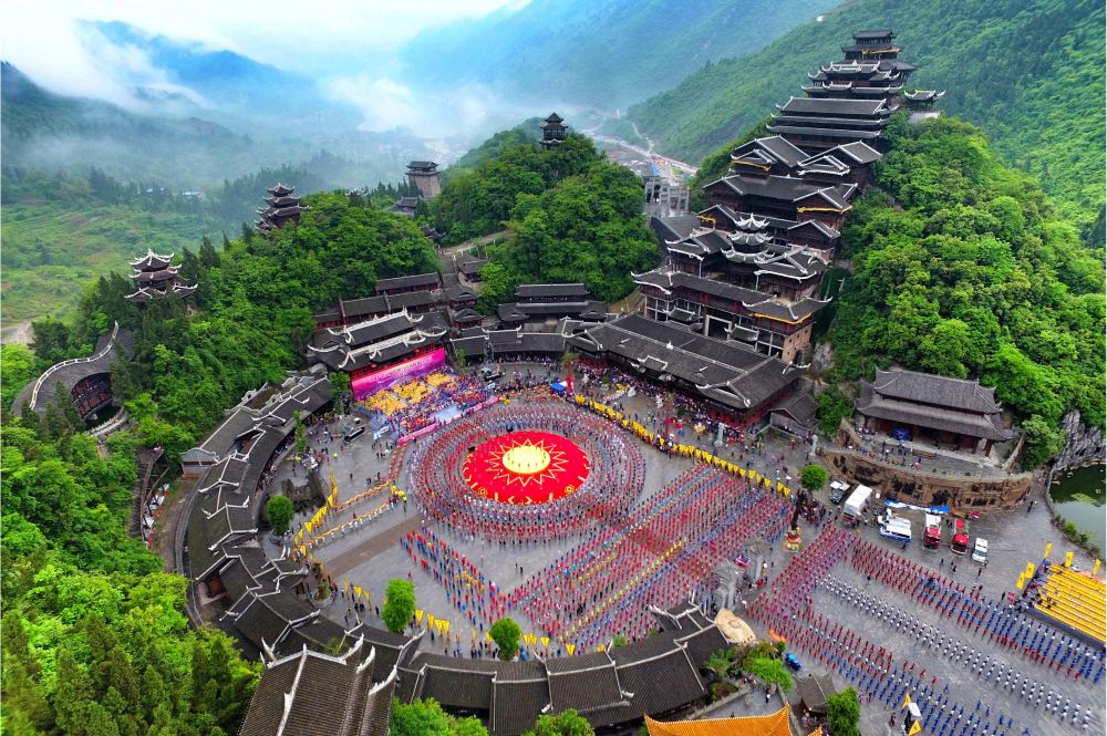 ▲ 以苗族始祖蚩尤文化为主线,集中展示了苗族的传统文化和建筑,充满了浓郁的苗族风情。总占地面积 10 平方千米,主要建筑包括标志门楼、九道门、九黎宫、九黎部落、北斗七星、苗王府、蚩尤大殿、禹王宫、善堂、盘瓠大殿、百苗长廊、九黎神柱、艺武场、百戏楼。