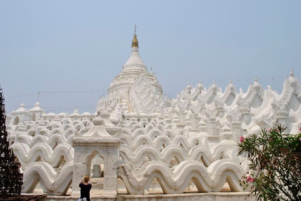 欣毕梅佛塔是一座有着波状台阶的白色佛塔建筑,从远处看好似一个奶油大蛋糕。这座佛塔根据缅甸占星术而建,按缅甸人的说法,这里便是世界中心。 佛塔设计为巨大的白色圆形,拥有7个半圆的平台,其护栏为波浪拱形,象征了围绕世界中心的七座大山和海洋。宝塔的最高处为圣坛。