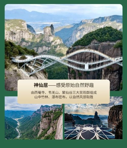 游览国家5A级景区—【大神仙居景区】(游览时间约4小时):西罨寺景区(原景区),韦羌山景区和聚仙谷景区三大部分组成,独特的生态环境和地质构造形成奇峰险崖,绝壁天坑,流泉飞瀑,云海雾涛,丛林百态的奇特景观,是一部地质学的教科书,生态环境的展览馆,人文历史。如意桥于2020年国庆期间亮相,刚柔并济的造型与神仙居的自然风光完美地融为一体,宛如一柄空中的玉如意,又似仙女的披帛。