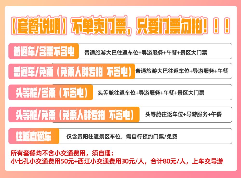▲ 【该行程有可能和其他行程客人并在一个团上,如介意,请勿下单哦~】 头等舱最后一排和安全门附近的位置不能调节哦,座位是先到先得的,导游不占座的哦 【所有儿童价格仅含】:贵阳到景点往返车位+午餐+导游服务,超高1.2m必需自理小七孔小交通费用50元+西江小交通费用30元/人,合计80元/人 一日游行程不含住宿,请提前自行预订西江住宿 现在贵州景区实行网上提前预约门票,如有特殊优惠证件的,请直接下单优待人群并告知客服免票证件类别,如团上临时告知,因门票已经提前预约无法取消,则无费用退还。