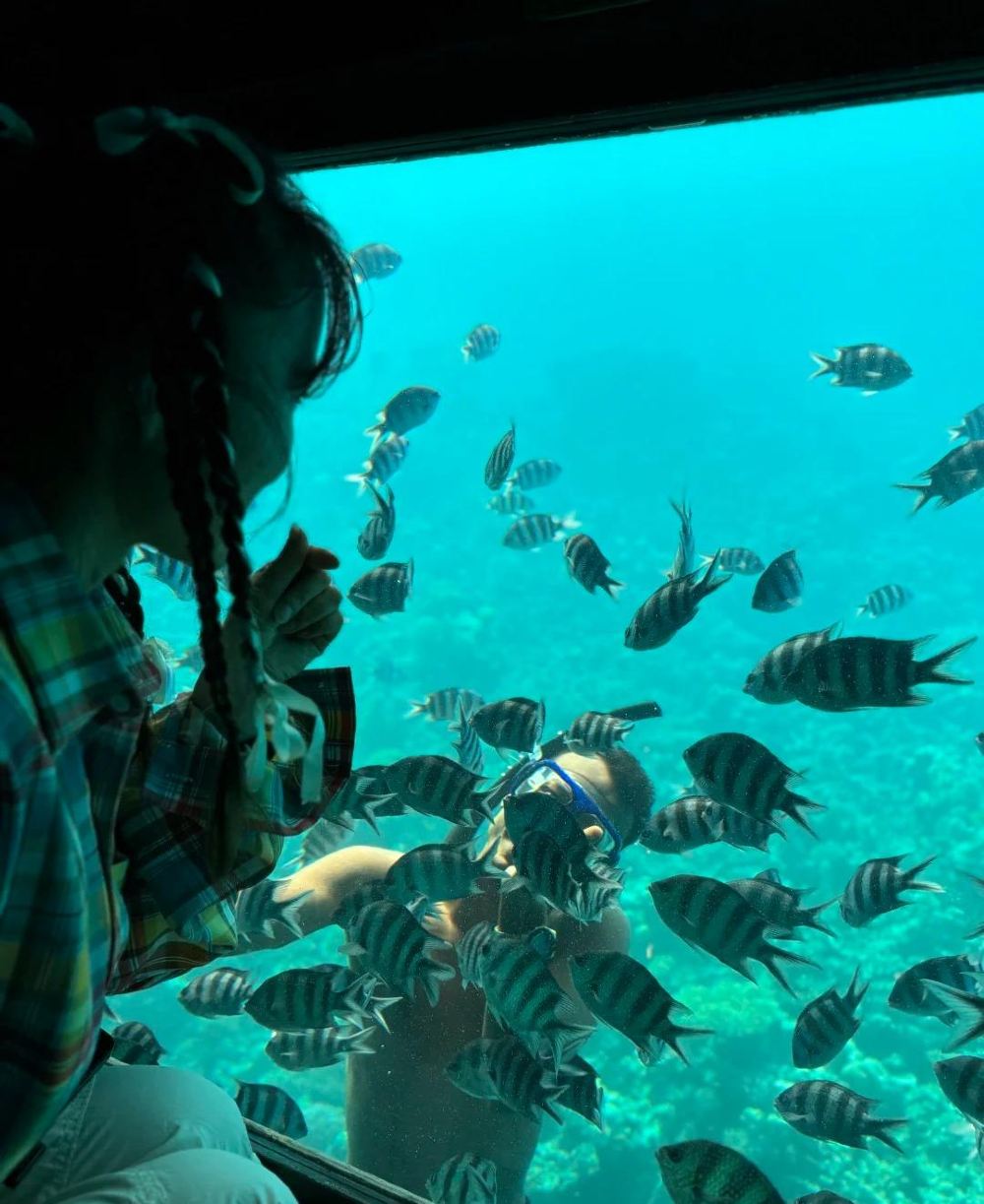 乘坐玻璃船,在船上透过玻璃观赏珊瑚群和热带鱼群