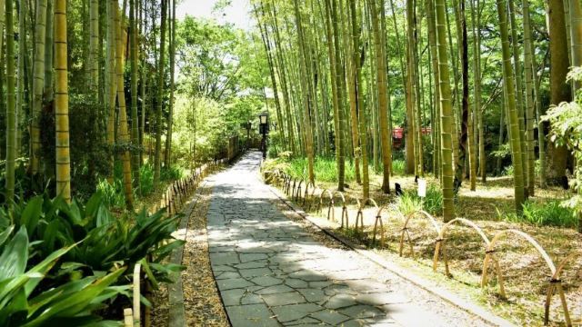 ▲ 【修善寺-竹林小径】 顾名思义,就是两旁翠竹密布的散步道。长两百七十公里的竹林小径,环境清幽,与世隔绝。置身其中,恍若进入陶渊明笔下描绘的桃花源。 竹林小径上面还有一座红色的枫桥,给绿意盎然的小径增添了一抹新鲜的颜色。小径上的竹制圆凳可供游客坐下细细品味这般美景。