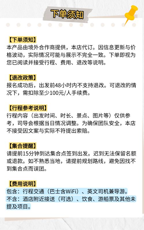 1.本产品由境外合作商提供,本店代订。由于产品信息实时更新、市场价格波动等可能会与您预订时展示的不一致。行程安排、费用说明、退改政策、其它说明等,您下单支付成功即默认您已阅读知晓并接受。