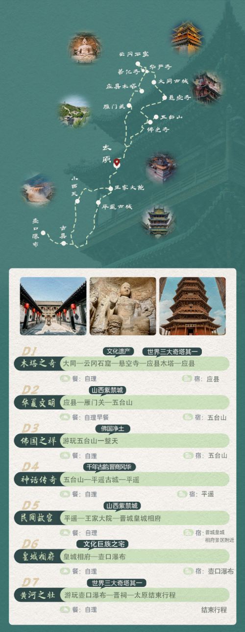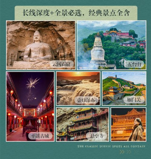 云冈石窟,悬空寺,应县木塔一日游,雁门关。五台山,佛光寺,南禅寺,晋祠,乔家大院,王家大院,张壁古堡,壶口瀑布《山西全境游6-7日游》私人定制包车
