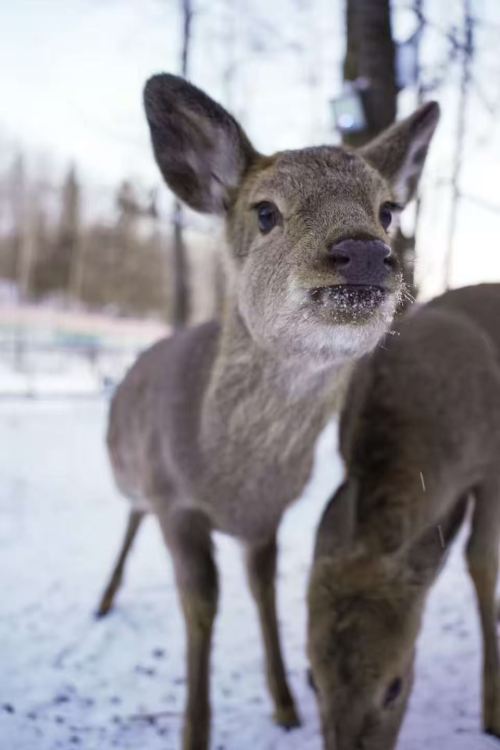 ▲ 游客拿着苔藓投喂小鹿,能近距离观察这些温顺的“森林精灵”。