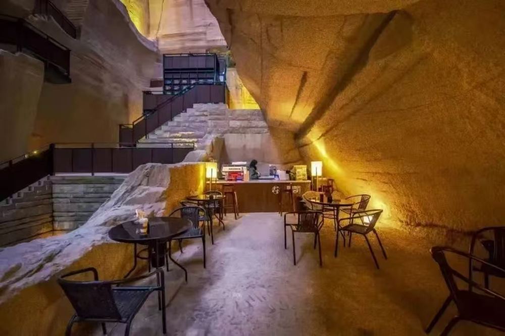 ▲ 岩宕书房,位于8号岩宕,净高38米、深度约50米,是顶部完全开放的露天空间。走进书房,一条长约20余米的“之”字形石径首先映入眼帘,随之看到的是周边一排排石台,还有上面那摆放着由竹楠木制成的书架与栏杆。