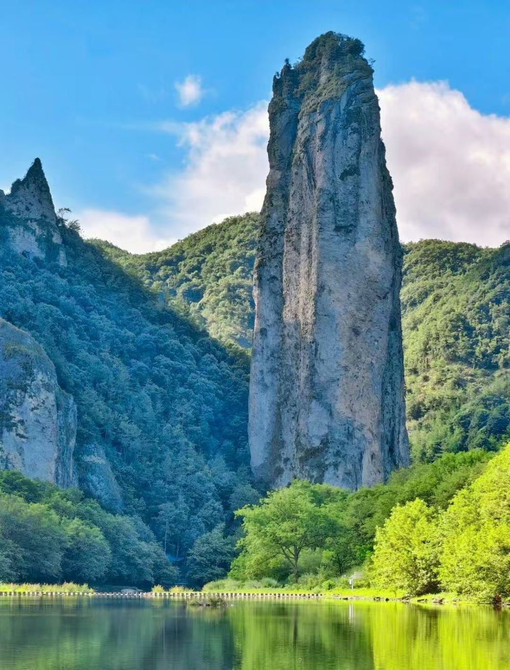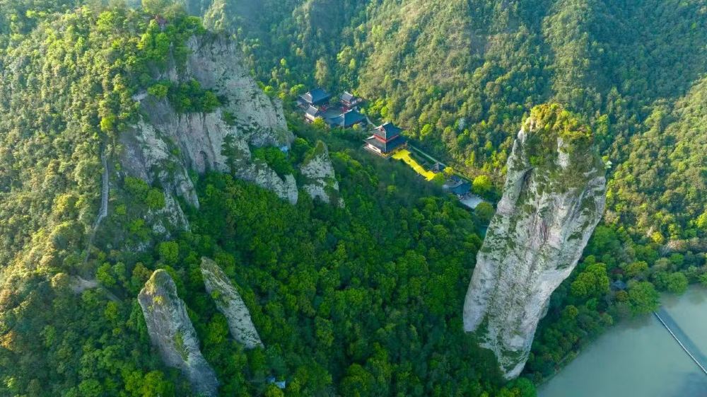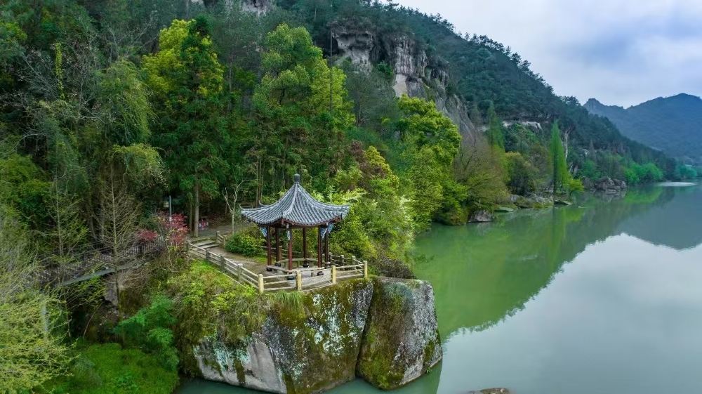 ▲ 朱潭山,南宋淳熙七年,著名理学家朱熹讲学于仙都,余暇时常到此闲散,泛舟于碧潭,游憩于山野。后人遂将此潭名为朱潭,遭边之山名为朱潭山。望峰亭,是游客拍摄湖峰倒影的最佳位置,著名摄影家吴品天先生获得国际摄影大奖的作品《仙境》即拍摄于此。