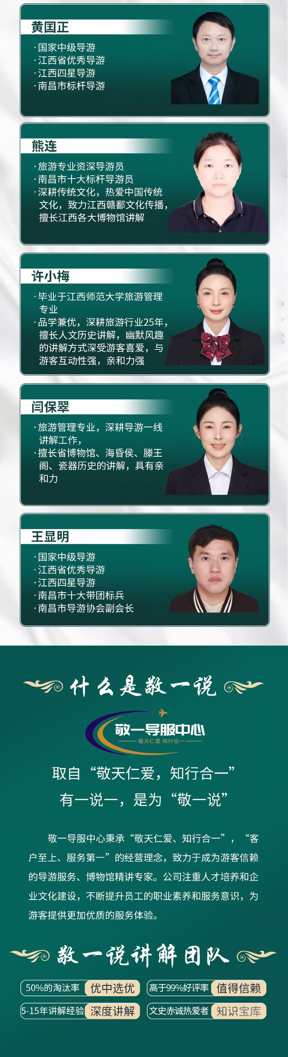 敬一导服中心秉承“敬天仁爱、知行合一,客户至上 服务第一”的经营理念,致力于成为游客、旅行社信赖的导游服务专家。公司注重人才培养和企业文化建设,不断提升员工的职业素养和服务意识,为旅行社、游客提供更加优质的服务体验。