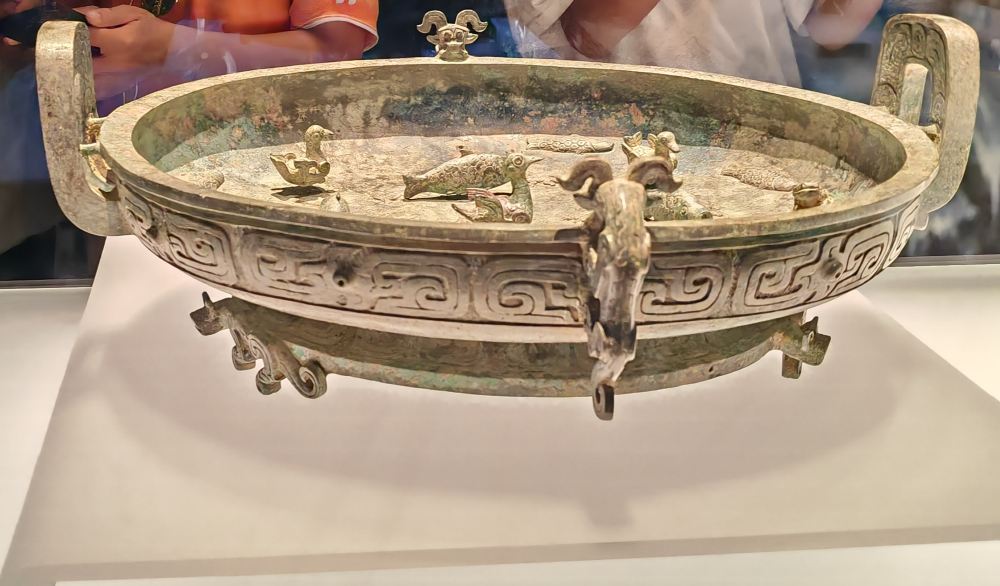 ▲ 子仲姜盘(春秋) 机械奇迹:盘内360°旋转的立体水鸟、青蛙,利用失蜡法空心铸造,水流冲击时可转动。