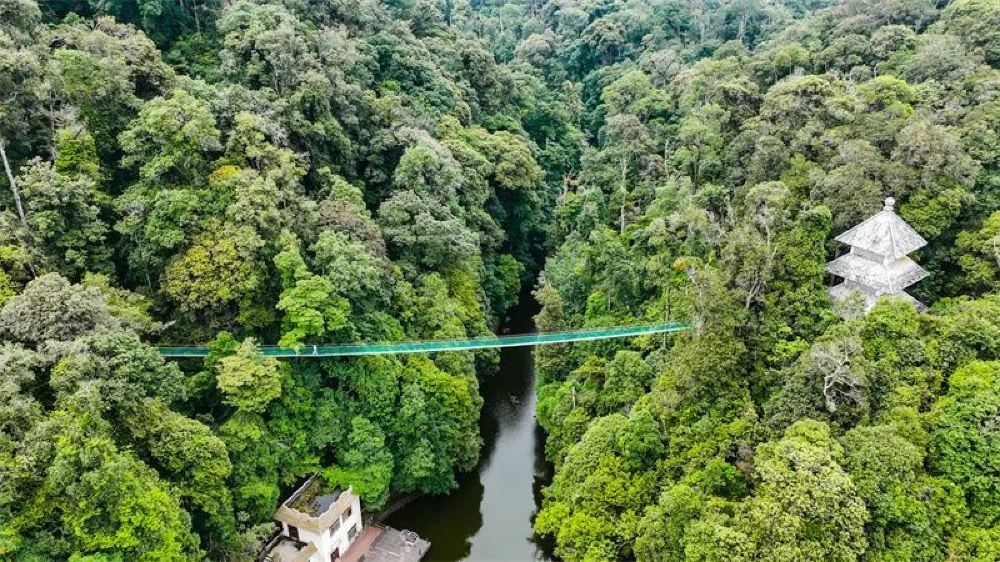 穿过苗城,去大围山“吸氧”,探秘现实版的“绿野仙踪”。乘上观光车穿越山林秘境,走过高悬山间的吊桥,沿着山间蜿蜒的小路,去遇见原始森林,听山林的絮语,自然的呼吸。在林海茫茫之中,近距离接触石斛、树蛙、格彩臂金龟等生物,感受生物多样性的神奇。立于山顶之上,看脚下的云海翻腾,云聚云散间,大围山仿若仙境,美不胜收。