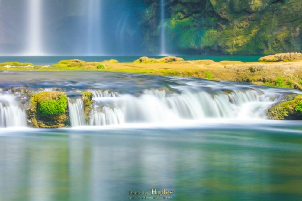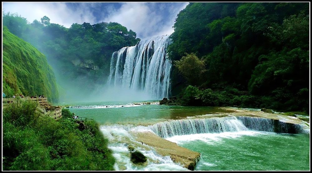 瀑布河水的流量,水小时只有几个流量,大时达到1000多个流量。水大时,瀑布溅珠飞洒到100多米高的黄果树街上,两三里外能听到雷鸣般的响声。水小时,河水仍然分成4支,铺展在整个岩壁上,不失其“阔而大”的气势。瀑布后有一长达134米的水帘洞拦腰横穿瀑布而过,由6个洞窗、5个洞厅、3股洞泉和6个通道所组成。从水帘洞内观看大瀑布,令人惊心动魄.