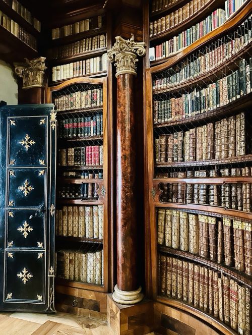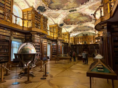 ▲ x修道院图书馆堪称“洛可可艺术之作”。馆内藏有17万册古籍,包括9世纪的拉丁文手抄本、中世纪宗教插画手稿,金箔装饰的书架与穹顶壁画极具视觉震撼。
