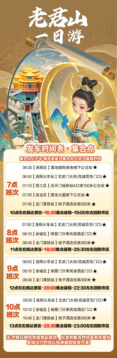 ▲ 7点班次 06:30【涧西区】富地国际商务楼下公交站 06:50[洛阳火车站】玄武门大街(花城百货门口) 07:10【西工区】应天门地铁站A口南100米公交站 07:30【洛龙区】国宝大厦楼下公交站 07:40[龙门高铁站】桔子酒店往南300米 10点左右抵达景区-16:30集合返程-19:00左右回到市区 注:节假日期间或遇景区限流,出发和集合时间会有所变化具体出行时间以导游通知短信为准!