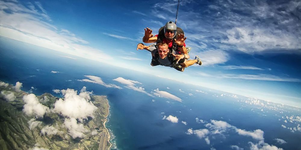 ▲ 滑翔伞之旅 突然——一片寂静。降落伞打开,喧嚣归于平静。在空中自由翱翔,饱览毛里求斯令人叹为观止的全景。聆听双人跳伞教练的指令,平稳着陆——心跳加速,笑容灿烂。
