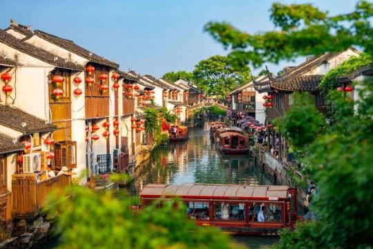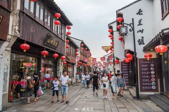 坐游船行于河道上,看绿柳拂水,河中舟船往来频繁,水乡的柔情被展现得淋漓尽致。若要在岸上感受水乡,那么登上山塘街的新民桥,便可将山塘河与两岸挂着红灯笼的老房子尽收眼底。山塘街上林立的美食店、工艺品店,也很能满足逛吃的需要。