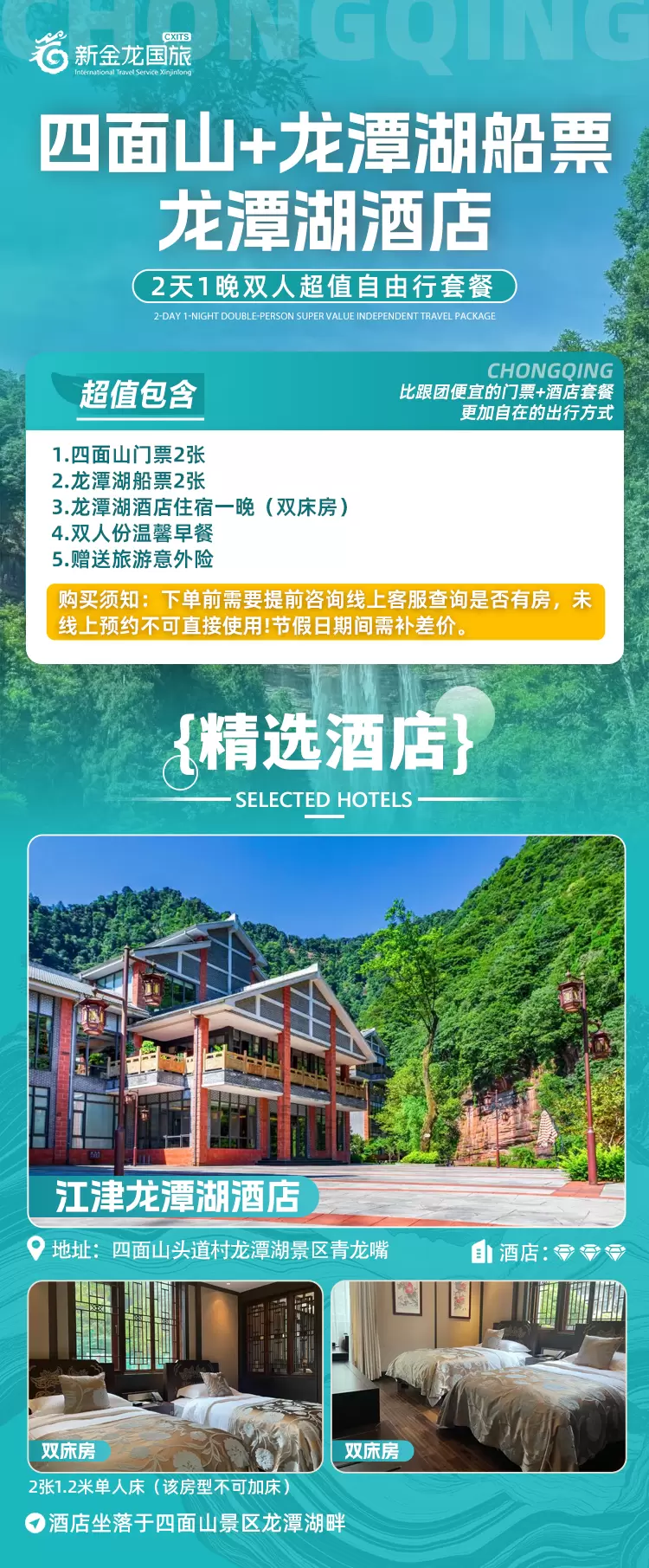 【酒店套餐】龙潭湖酒店1晚+四面山+双人龙潭湖游船+双早