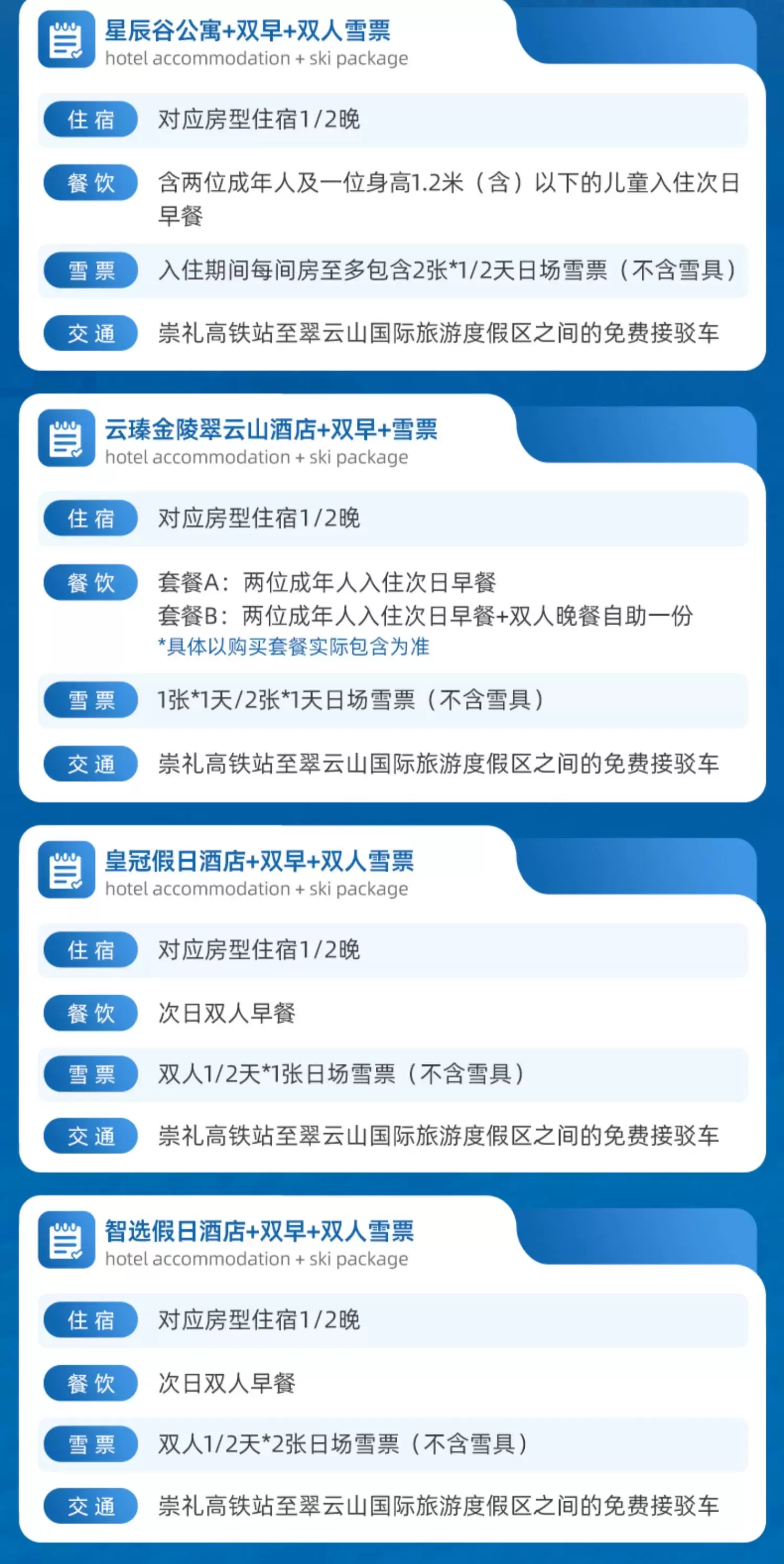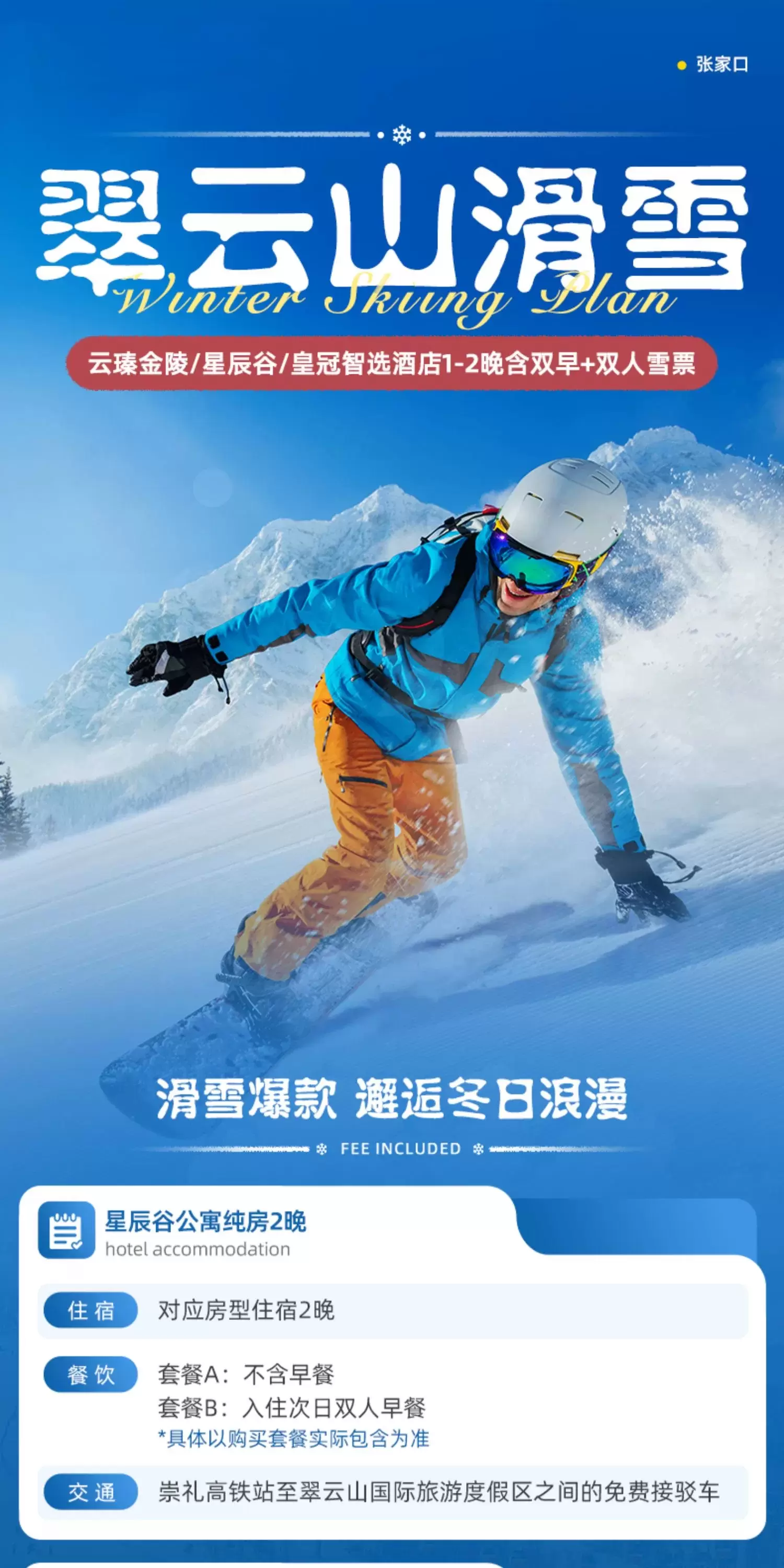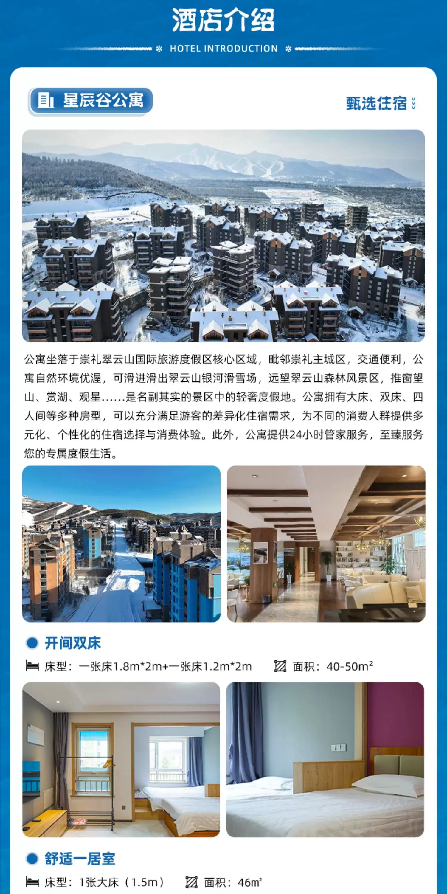 【滑进滑出】3钻星辰谷公寓1晚/2晚+1天/2天翠云山银河滑雪场雪票(不含雪具)+早餐(翠云山旅游度假区)