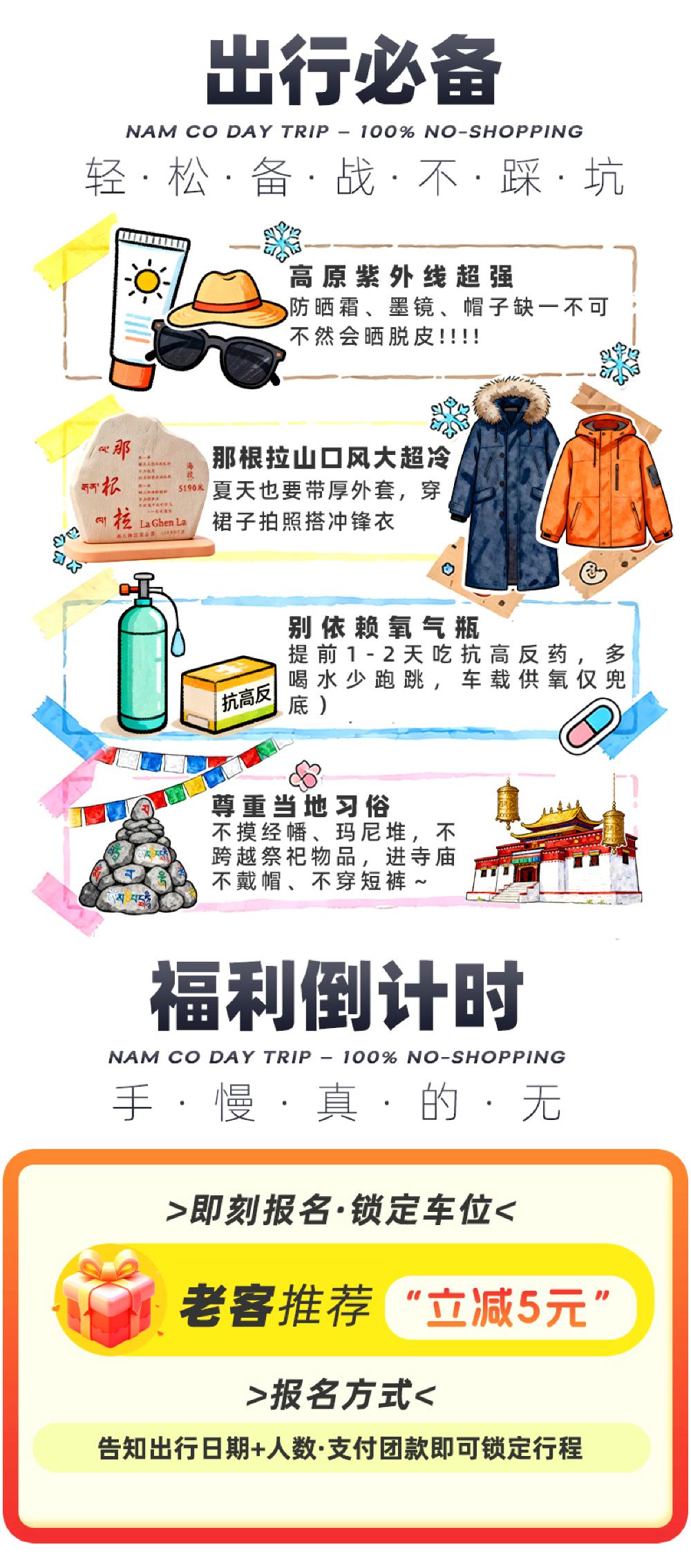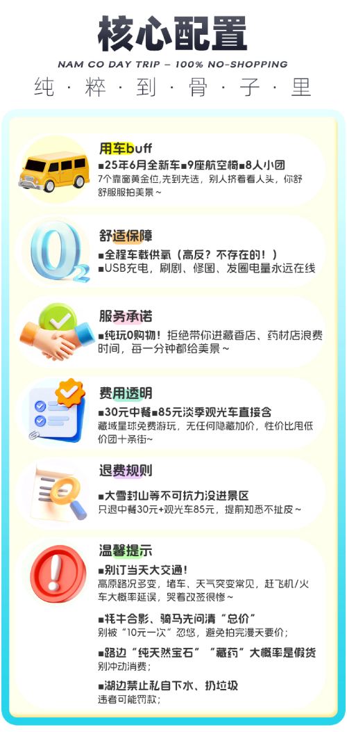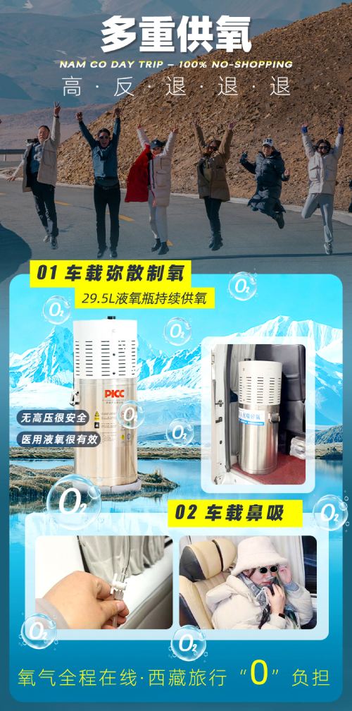 两款套餐均可自带常规氧气上车,超重型氧气瓶、超大型氧气袋禁止携带(前者无法固定易磕碰,后者遮挡视线且有易燃易爆隐患);本行程纯玩无购物,坚决不进氧气店、不卖高价氧气。