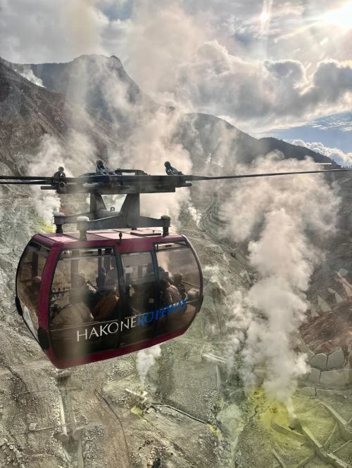 ▲ 大涌谷的景色非常震憾,荒凉的山体和喷发的烟雾演绎出独特的景观,不愧曾被称为地狱谷。在大涌谷上方运行着箱根空中缆车,前往桃源台方向的途中还可欣赏富士山和芦之湖的景色。