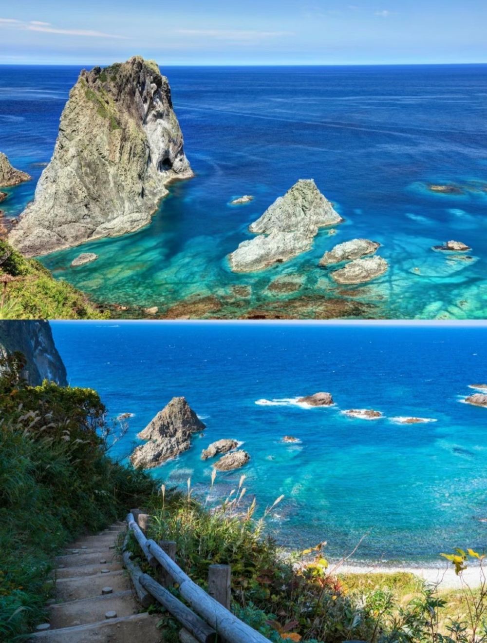 ▲ 岛武意海岸(Shimamu Coast) 岛武意海岸位于北海道积丹半岛,是日本“秘境百选”之一。站在高处俯瞰,可以看到湛蓝的大海与奇岩断崖交织的壮丽海岸线,景色原始而震撼。穿过狭长的隧道后豁然开朗,一望无际的积丹蓝海水映入眼帘,被誉为“积丹蓝”代表景点之一。