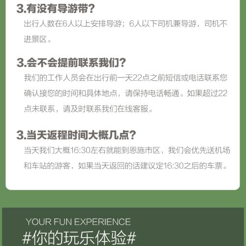 1、因恩施属于山地,旅游车需要加刹车降温水,前往景区的途中有很多农民给大巴车免费提供加刹车降温水,给游客免费提供卫生间、免费加茶水等,同时将自己种植的茶叶或y材销售给客人,沿途农民设的这种场所属于公共购物场所,不属于我社安排的购物店,请谨慎购买。