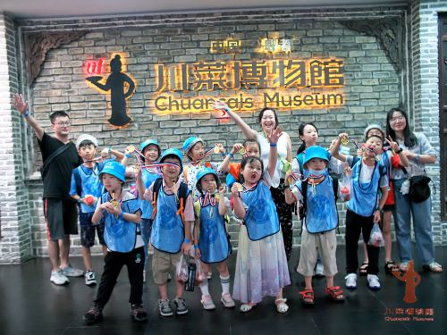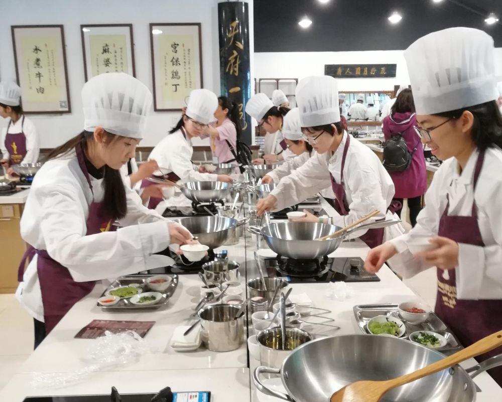 ▲ 参观典藏 馆、川菜原料展示区、舀酱油翻晒豆瓣、饮水思源、祭灶王、穿汉服体验、蒙眼大刀切金丝面。加工工具区(推石磨)、自己制作宫保鸡丁、颁发证书。