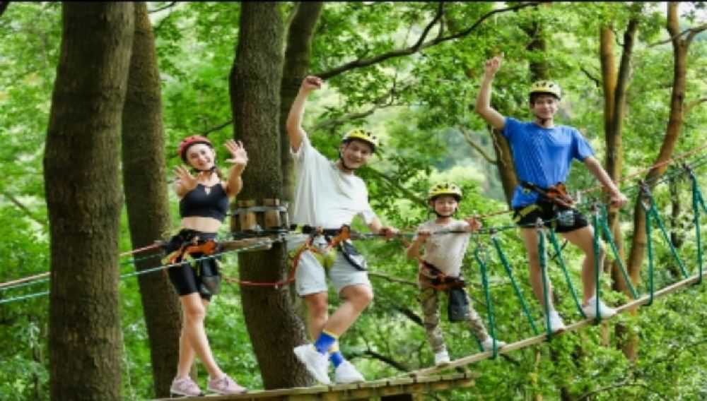 ▲ 黑线(五星难度);适合身高1.4米以上的儿童及成人 黑线关卡:攀岩墙--形桥--泰山跳--印度桥-印地安步--吊桥--晃动绳梯--极度穿越--西藏桥--飞荡--蛇形桥--极度穿越--圆木梯--极度穿越--转动的圆木棍--极度穿越--桶箍--巨人步--平衡穿越--极度穿越;
