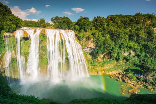 ▲ 黄果树瀑布:亚洲瀑布群的震撼体验 高 77.8 米、宽 101 米的主瀑布如银河落九天,可穿越 134 米长水帘洞触摸飞溅水雾,近距离感受《西游记》取景地的磅礴气势。丰水期(6-10 月)水幕铺展至对岸山崖,枯水期(12-4 月)可见瀑底钙华滩的肌理层次,摄影爱好者可捕捉 “彩虹挂瀑” 奇观(午间阳光直射时概率较高)。