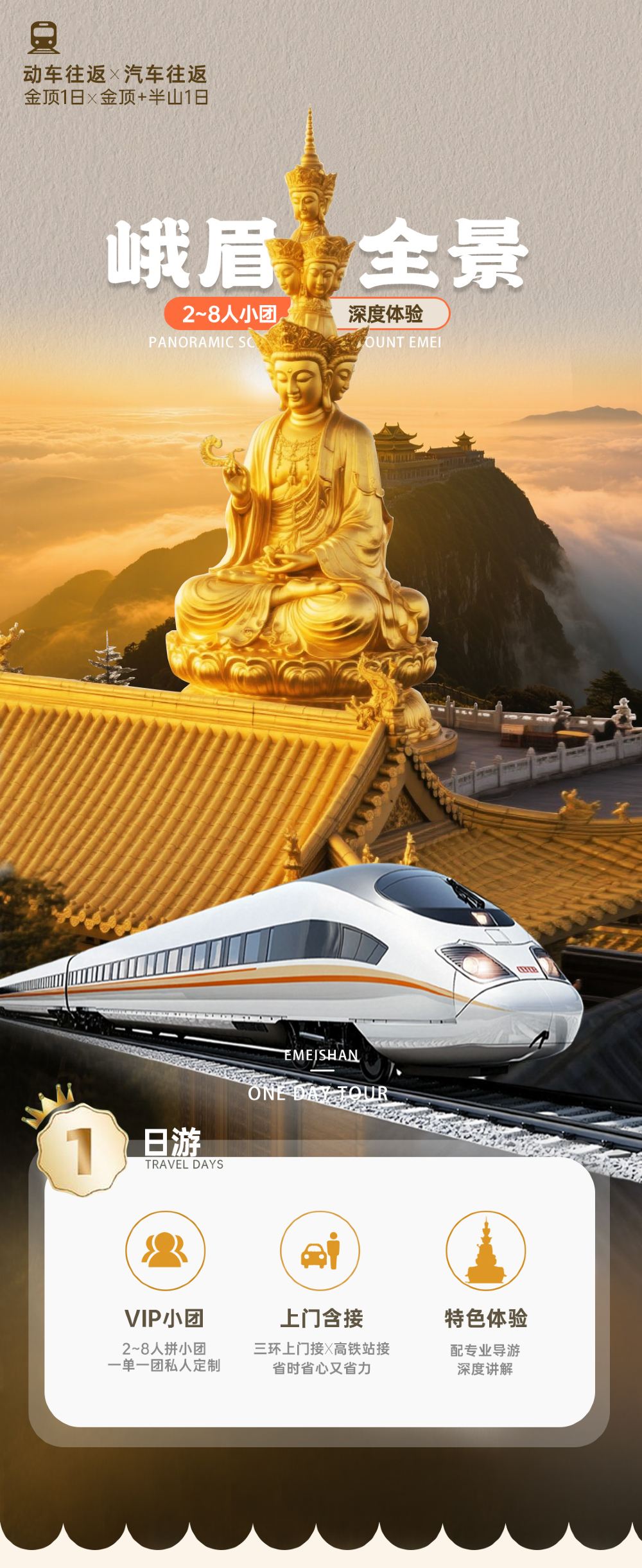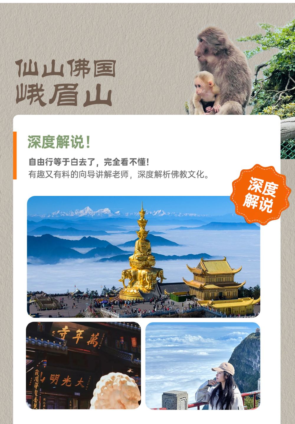 峨眉山一日游【8人精致小团丨专职导游深度讲解丨可选动车往返】【【精华双区联游】1日尽览峨眉山金顶壮阔风光,走进半山万年寺清幽禅意,不留遗憾;】