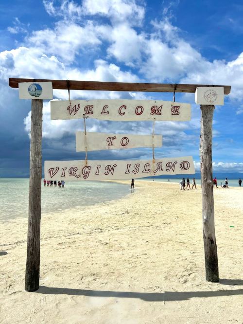薄荷岛附近的处女岛是一个非常美丽的无人小岛,这个小岛有一个迷人的长长弯弯的月牙形沙滩,像极了新娘婚纱蜿蜒的拖尾,退潮的时候它就会完整的显现出来,在水中可以走出几百米远,海水清澈透亮,颜色层次分明,仿佛童话世界。一般在上午和中午退潮时候可以登陆这个小岛,早上和晚上有潮的时候,小岛会被淹没,只露出海滩上的植被。沙堤外面的海床上全是茂密的海草,而海草中,埋了很多“地雷”——海胆!这也正是尽管水很浅,但人却不能涉水上岛的原因。中午上岸时,有许多卖海胆的渔民,可以尝尝生猛的鲜海胆,非常刺激。