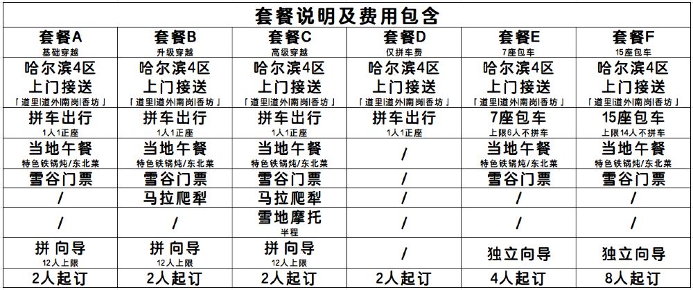 包含:哈尔滨4区上门接送7座车费+当地午餐+雪谷门票+独立穿越向导「4人起订」