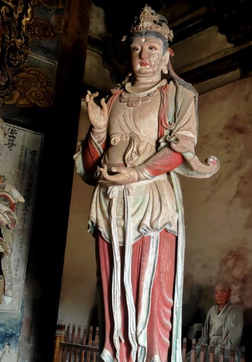 ▲ 福胜寺布局严谨,坐北向南,寺内沿中轴线建筑为包括山门、天王殿、弥陀殿、三佛洞和藏经阁等,两侧则有钟鼓楼、三圣娘娘殿、东西配房、厢房等 弥陀殿:弥陀殿坐落在5米高的台基上,整个建筑五间见方,四周围廊,重檐九脊顶,展现了元代建筑的明显形制。 彩塑:弥勒殿内的彩塑是元代作品,包括正中的弥陀佛、左右的观音和大势至菩萨站像,以及主佛像背面的元代彩色悬塑渡海观音,还有明代补塑的四大天王与十八罗汉、善财童子、明王及供养人等塑像。