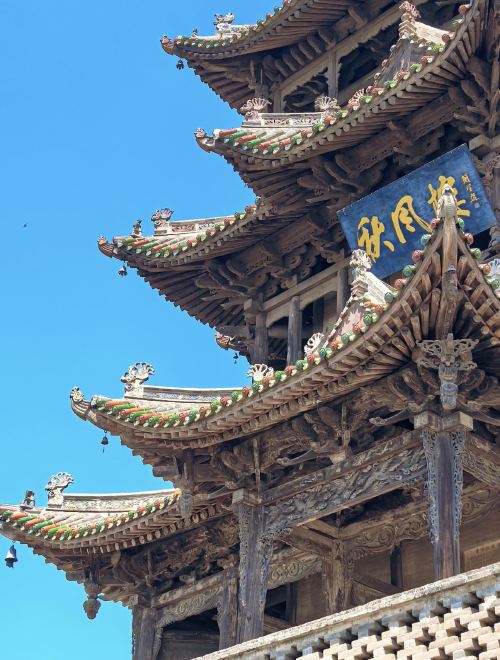▲ 飞云楼为纯木质结构,外观三层内部实为五层,总高约23米,十字歇山顶。底层木柱林立,中央四根各高15米的通柱直达楼顶。三层四出檐,二、三层各出抱厦一间,均设平台勾栏,又用平柱分成三小间,上筑屋顶。山花向前,下用穿插枋和斜材挑承。全楼共有斗拱345组,32个屋角,真可谓斗拱密布,而且形状极富变化,犹如云风族拥,鲜花盛开。飞云楼是东岳庙建筑群中的代表,与万荣后土祠秋风楼、解州关帝庙春秋楼并称“河东三楼”