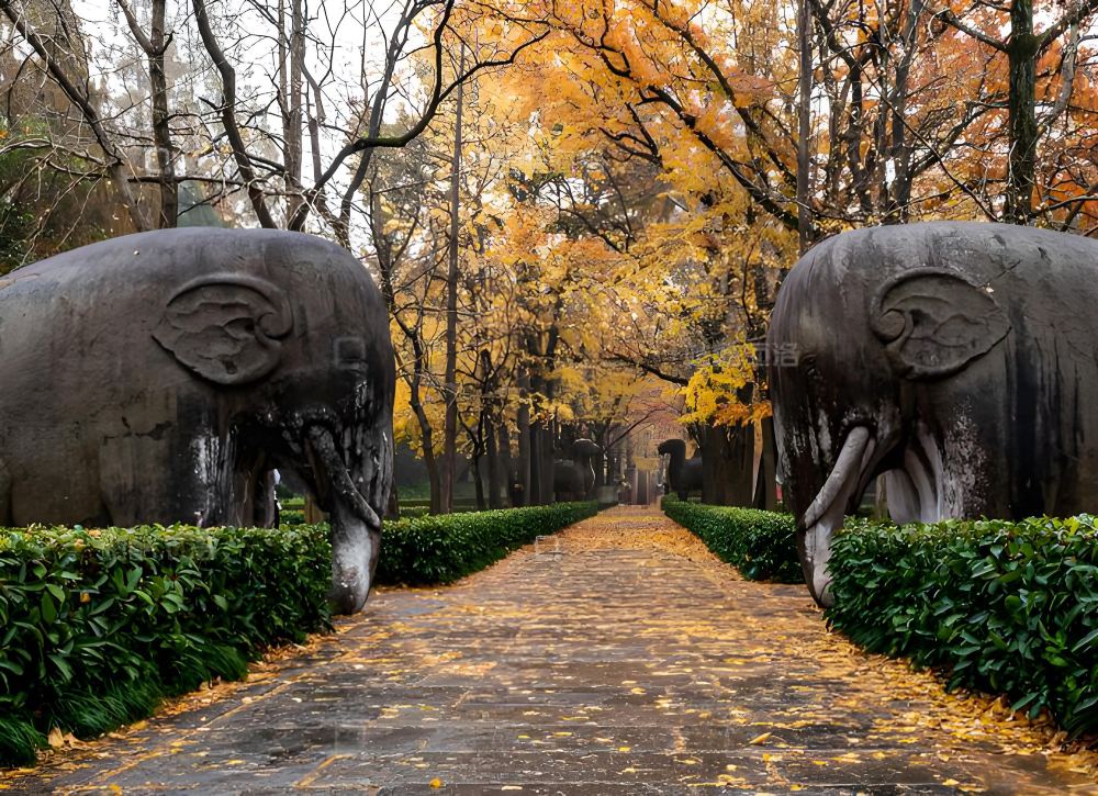 ▲ 脚下是明太祖朱元璋陵寝的神道,肃穆的文武翁仲与石兽已静立六百年。阳光穿过斑斓的乌桕与银杏,在石刻上投下流动的光影,每一步都踏在厚重的史册上。秋日的石象路像打翻的调色盘。不必刻意寻找机位,任何角度都是一幅油画。不妨放慢脚步,触摸冰凉的石头,感受时光在这里留下的温度。