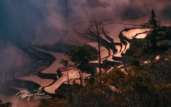 ▲ 破晓前,梯田隐于浓稠夜色,仅凭星月微光勾勒轮廓。晨雾如乳白色绸带缠绕山腰,哈尼族蘑菇房村落悬浮云海之上,仿若“遗失的云端秘境”
