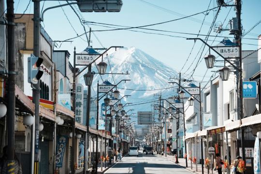 ▲ 日川时计店 在富士吉田市,日川时计店前的街道已成为一个现象级的网红打卡点。站在街口望去,笔直的道路尽头,富士山壮丽的山体赫然出现在低矮的民居屋顶之上,构成一幅极具视觉冲击力的经典画面。清晨时分,阳光为山体镀上金辉,是捕捉这一“街道与富士山同框”奇景的时刻。