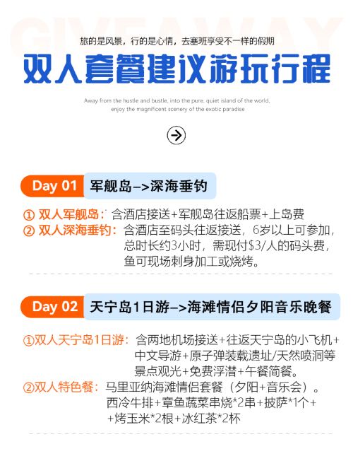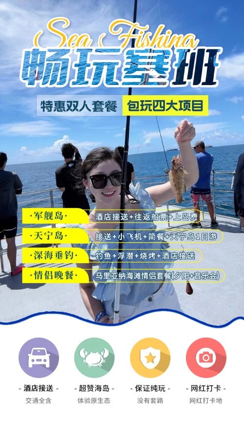 美国塞班岛双人套餐【军舰岛+海钓+天宁岛+海滩情侣音乐晚餐】【1. 塞班岛旅游局官方认证地接社,持证中文导游服务,含酒店接送。】
