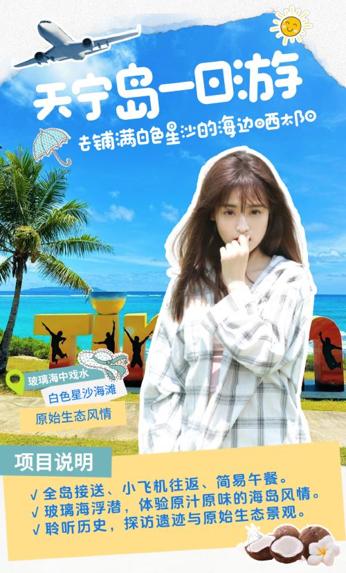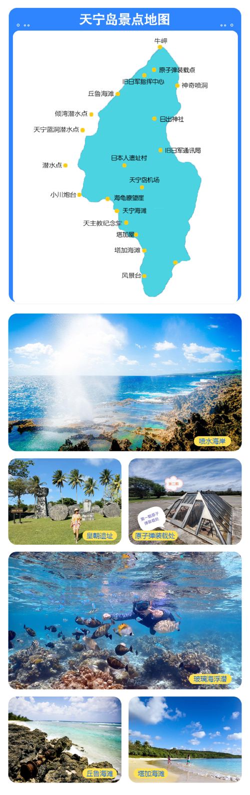 含两地机场接送+塞班岛往返天宁岛的小飞机+天宁岛导游服务+原子弹装载遗址、天然喷洞等景点观光+免费浮潜+午餐简餐。
