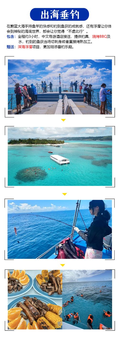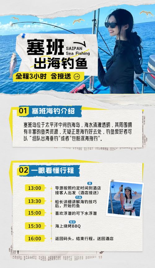 含酒店至码头往返接送,6岁以上可参加,时长约3小时,需现场支付$3/每人的码头费,鱼可现场刺身加工。
