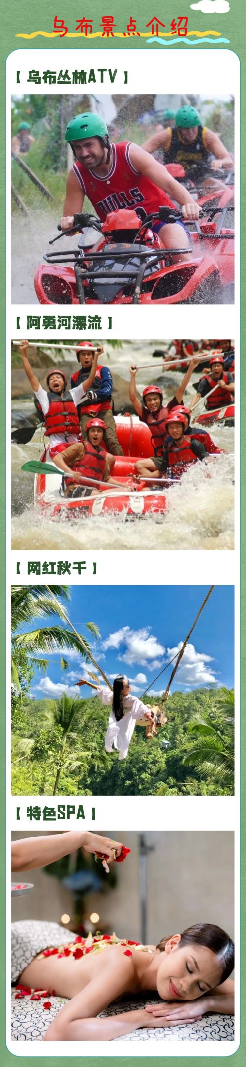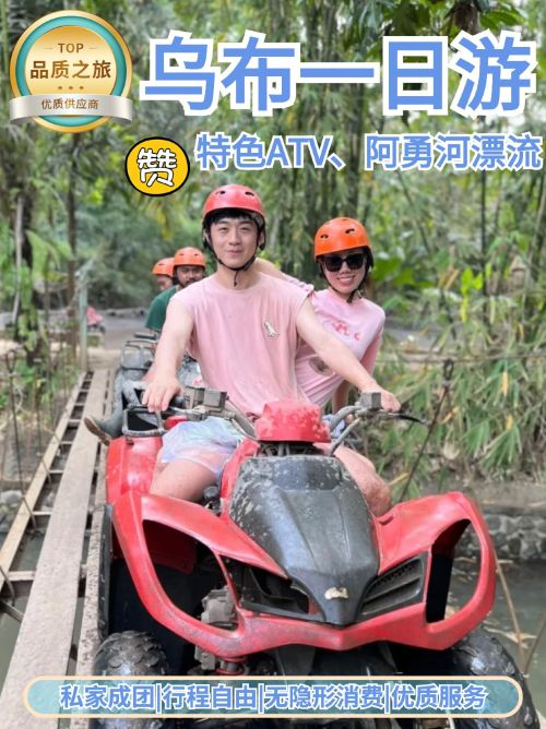 巴厘岛乌布一日游【丛林ATV|阿勇河漂流|网红秋千|SPA】【[玩家级路线]2人起订私家团,全程中文司机专车接送,体验乌布丛林越野及漂流的刺激】