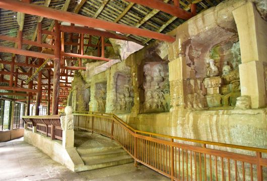 ▲ 北山摩崖造像始刻于唐末,至南宋结束,北山石刻位于大足区城北2千米的北山上。以大佛湾为中心,遍及其四周的观音坡、营盘坡、佛耳岩、北塔寺共五处。长达500多米。岩高约7米,沿崖造像。从南到北形状若新月,龛窟如蜂房。造像5000余尊。造像细腻精美,技艺娴熟巧妙。除部分碑刻、塔幢和浅小龛窟残毁外,其余均保存完好。