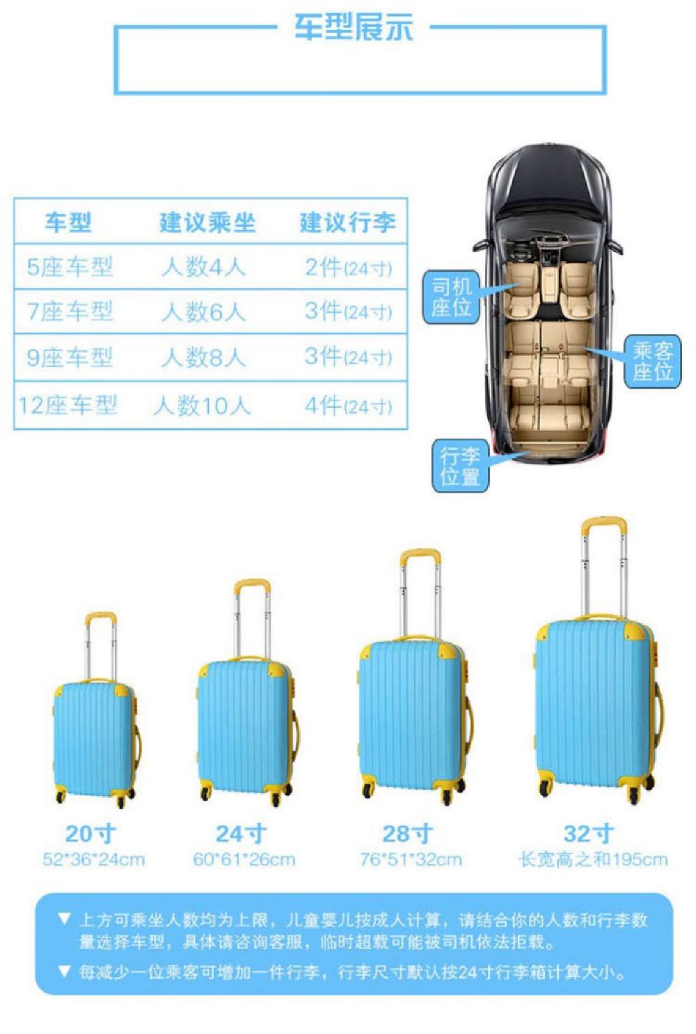 包车车型说明:五座车可乘坐4人,七座车可乘坐6人,依次类推。