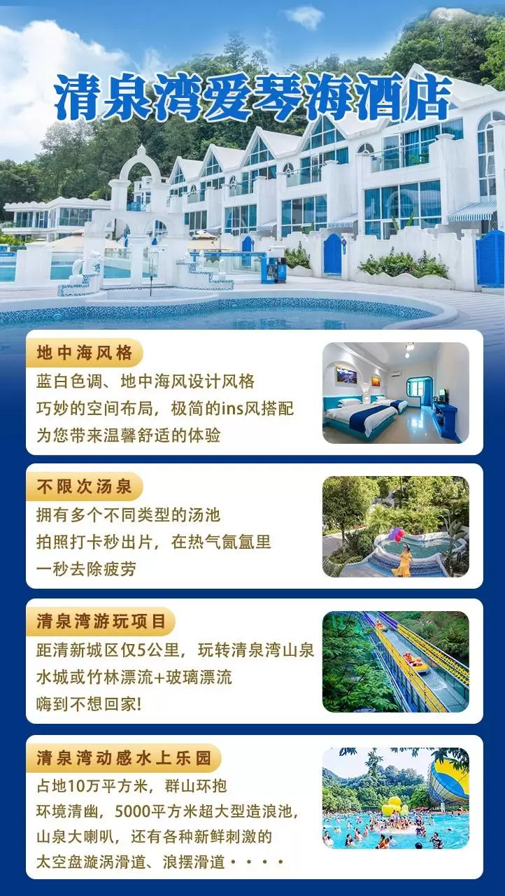 全新开业|清远清泉湾爱琴海酒店+畅泡清泉湾温泉+景区观光+乒乓球/羽毛球/台球畅玩,可加订竹林漂流或水上乐园