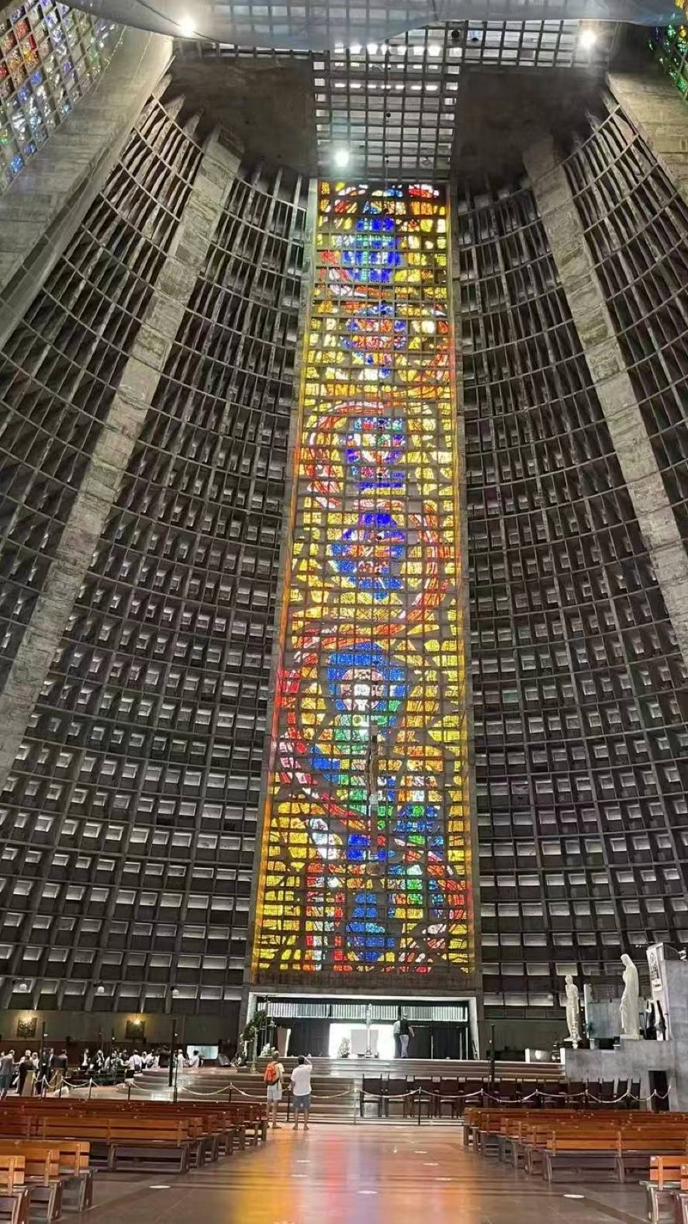 ▲ 里约热内卢主教座堂,又称天梯教堂,是里约的标志性建筑之一。它始建于1964年,1976年落成。其主体为圆锥形钢筋水泥结构,如同一架通向天堂的天梯。教堂内部宽敞高大,可容纳2万人。顶端的玻璃十字架与垂下的彩绘玻璃窗在阳光照射下光彩夺目,营造出神秘而庄严的氛围,让每一位参观者都能感受到心灵的震撼与洗礼。